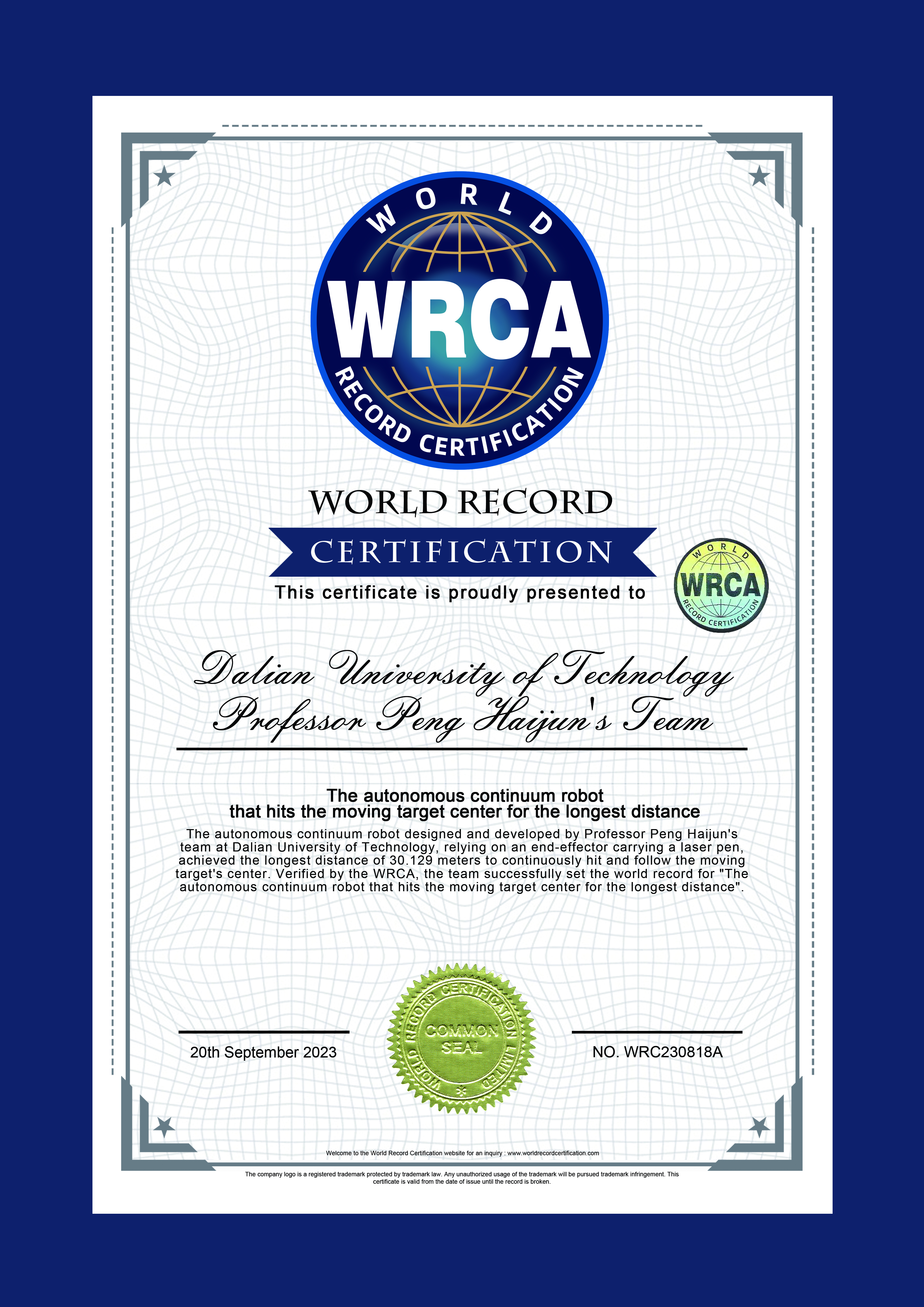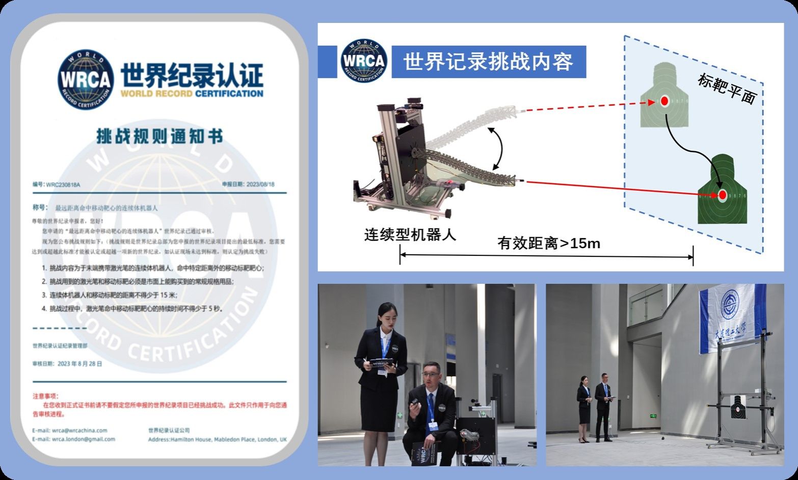 2023年9月13日,伟德国际victor1946彭海军教授团队创造了一项新的世界纪录:团队研发的自主连续体机器人命中移动靶心的距离最远,挑战成功的最远距离达到30.129米,获得WRCA世界纪录认证。