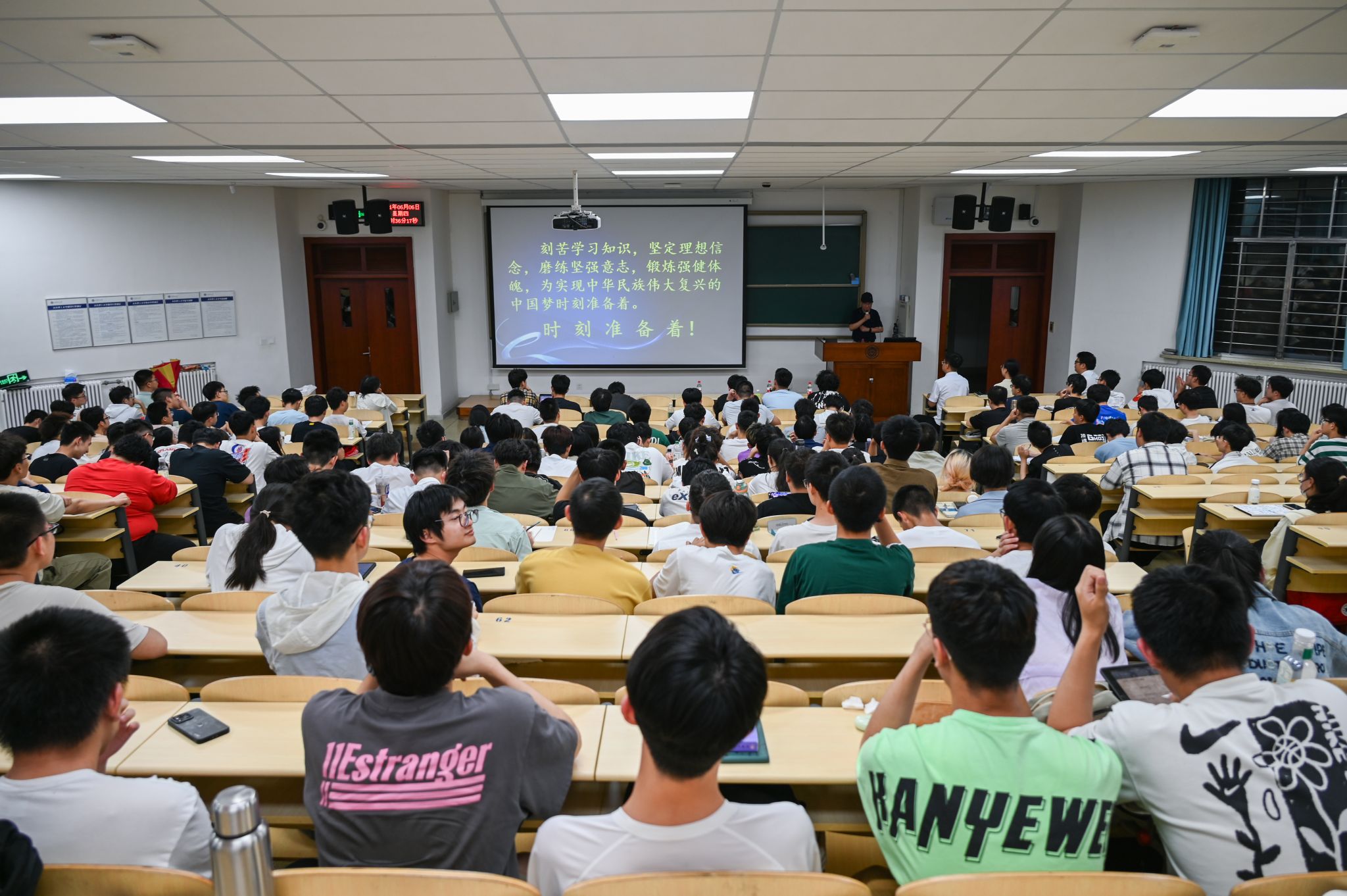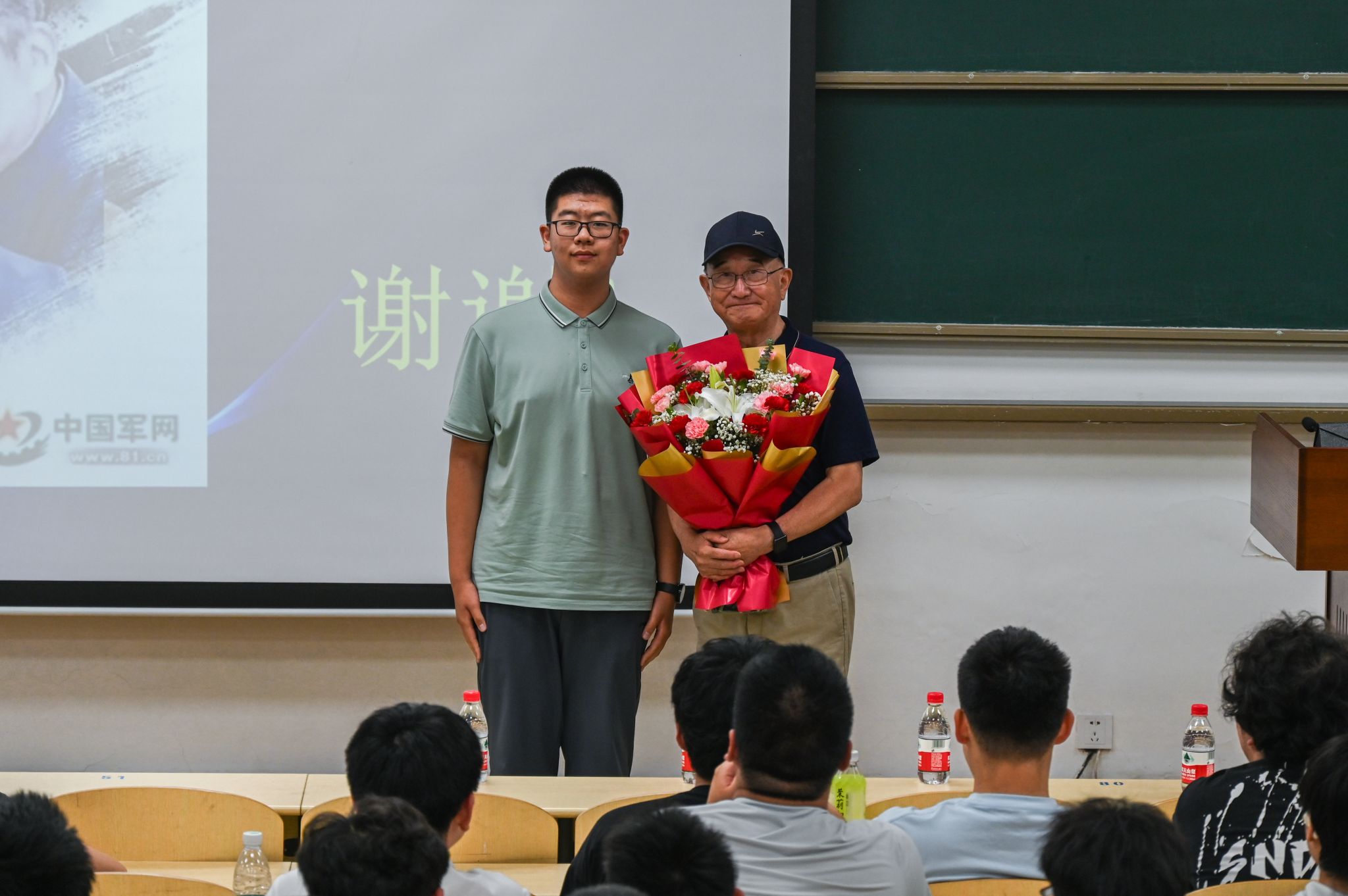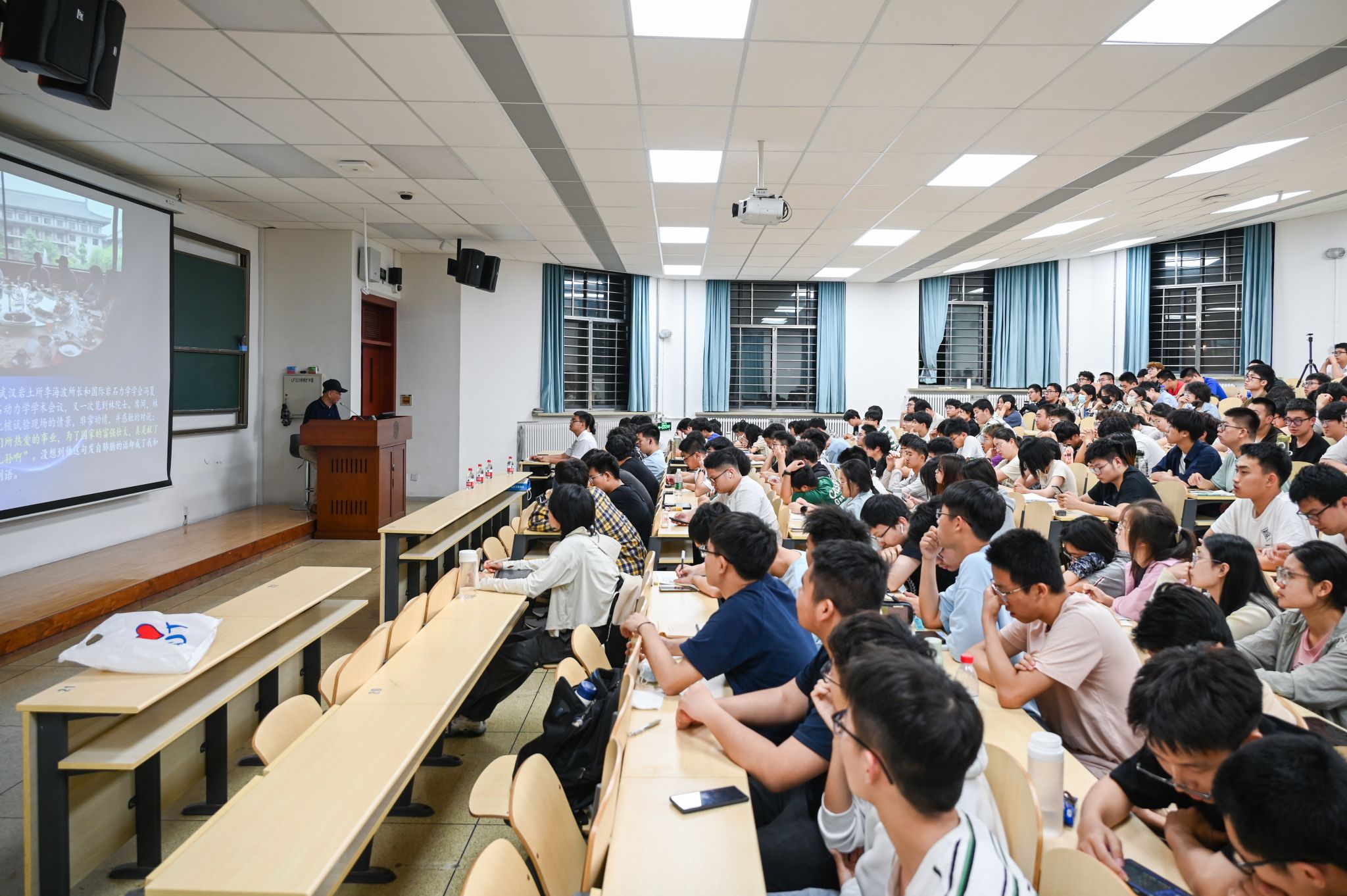 随后,李老师重点讲述了马兰精神,讲述了他与熟悉的两弹一星功勋的故事。李老师声情并茂地讲述了王淦昌先生的选择,“可以没有诺奖,但不能没有核弹;可以没有自己,但不能没有我亲爱的祖国”;坠机罹难的郭永怀先生与警卫员的遗体紧紧相拥,保护下重要的实验数据文件;林俊德先生尽管已癌症晚期,但离世前以超常的意志先后9次要求下床工作到生命的最后一刻……倾听着李老师讲述功勋们的动人事迹,在场师生无不热泪盈眶。