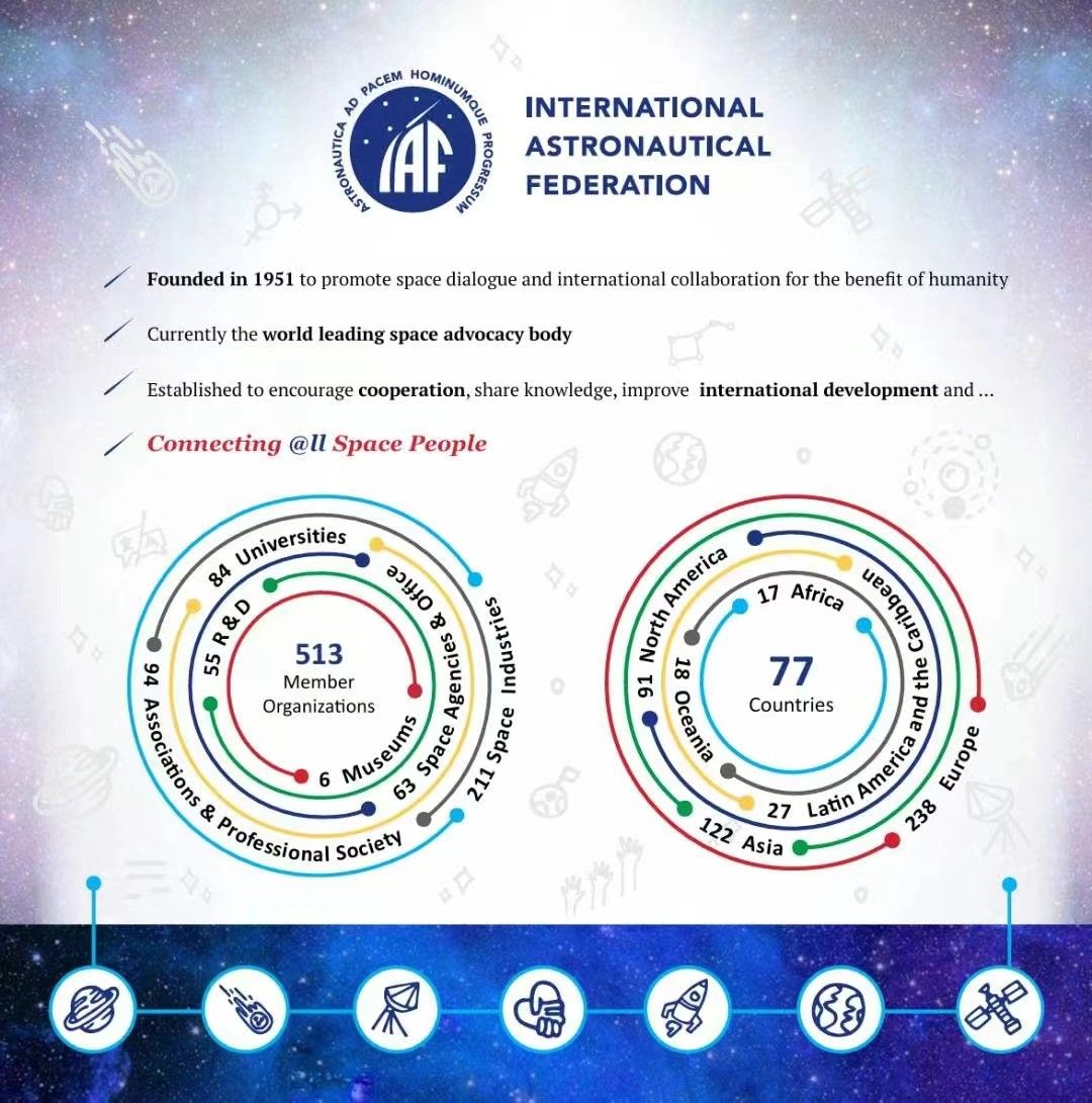 国际宇航联合会总部设在巴黎,是负责联合国下属航天事务的唯一非政府组织,同时也是联合国和平利用外层空间委员会(COPUOS)的技术咨询机构,是世界上最知名的国际宇航组织之一。目前国际宇航联合会有超过77个国家、513个会员单位。