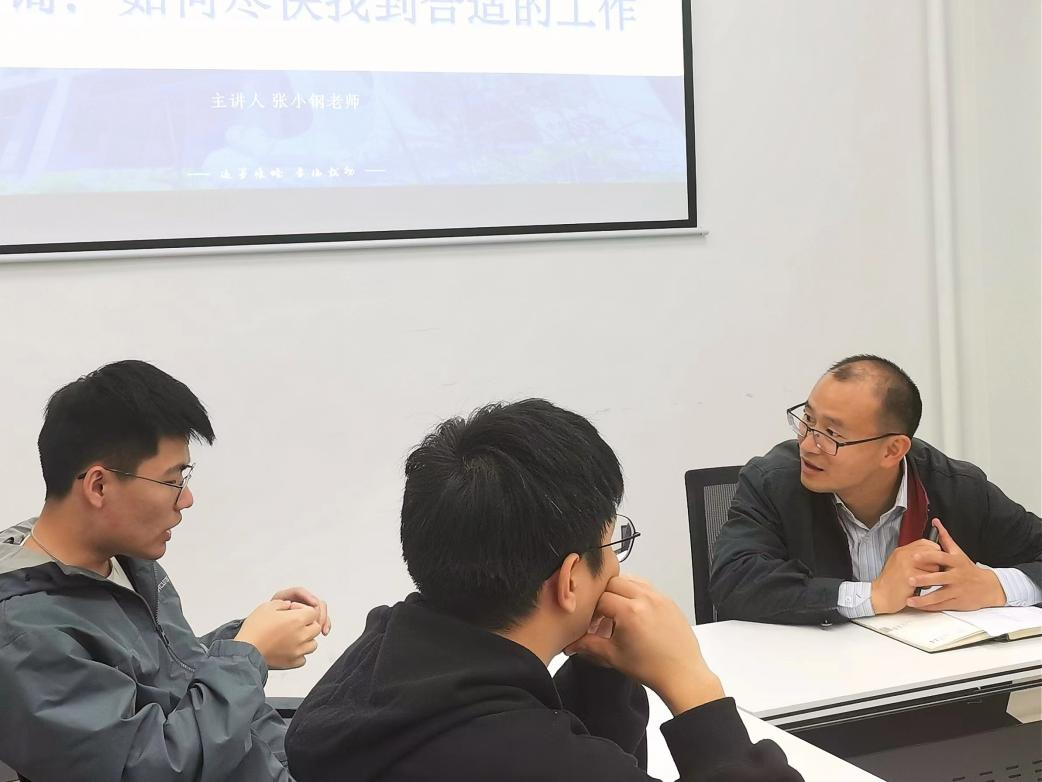 座谈中,张小钢老师逐个了解同学情况,从生涯规划、目标地域、企业类型等多个方面了解同学们的就业目标,交流同学们的个人发展状况,对不同类型的同学定制个性化就业建议,希望同学们综合考虑单位的所处地域、工资待遇水平、岗位职责等因素,以“保住温饱,力求小康”的态度对待择业期的选择问题。对于考研/考公与就业“双赛道”并行的同学,张老师提出要首重知识掌握,认真复习备考,也要确定备选方案,积极联系企业,了解就业现状与情况。同时要对自身的综合能力建立正确认识,分析个人长处,补齐能力短板,找到适合自己的就业方向。职业选择与规划不能过于偏执强求,要针对个人情况以及客观因素进行调整,不必苛求十全十美。