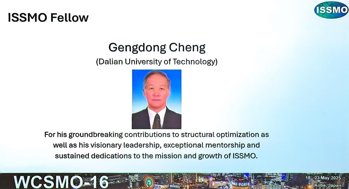 在本次大会上,公司程耿东院士因其在结构拓扑优化领域的开创性贡献,荣获了ISSMO最高荣誉—首届ISSMO Fellows Award(For his groundbreaking contributions to structural optimization as well as his visionary leadership, exceptional mentorship and sustained dedications to the mission and growth of ISSMO)。