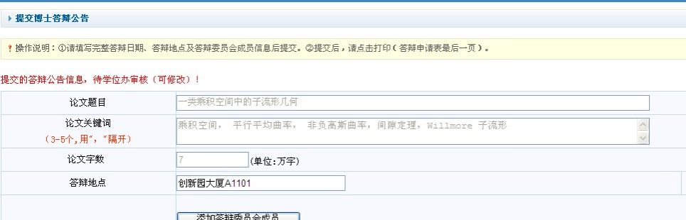 ※如在『提交答辩申请』中答辩组有需要更换的成员,或答辩时间有调整,可以在此处进行修改