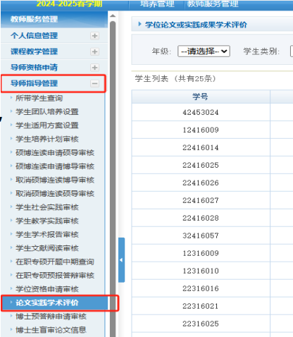 2、导师需要在【研究生管理信息系统】的导师指导管理-论文时间学术评价中客观填写其所带员工的学位论文或实践成果的学术评价。