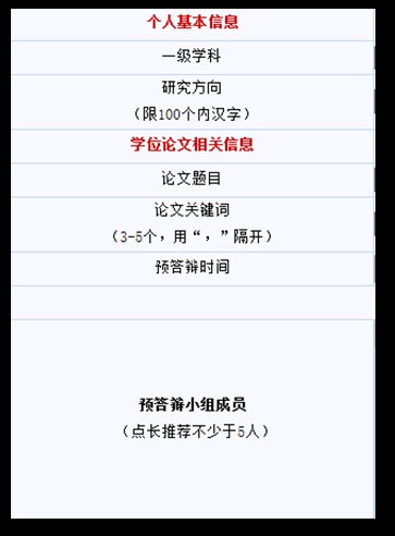 博士生要在预答辩前两周向所在学科点点长(若学科点点长为申请人的导师,申请表中点长签字处由院系其他点长代签)提交如下材料申请预答辩: