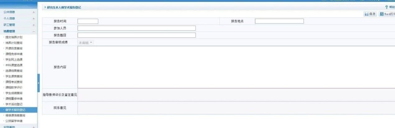 3、参加学术活动情况(要求:主讲报告5次,听报告24次,在研究生管理系统“学术活动录入”,其中要录入一条完整的学术活动,如下图);