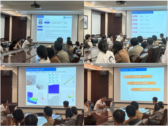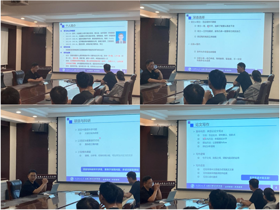 赫万鑫同志从自己的读博经历对大家进行介绍,在深造选择方面告诫大家博士就要卷,躺不平,选择了就要认真走下去,并且分享在文献阅读技巧相关知识。同时在论文写作方面,赫万鑫同志也分享了自己独有的见解,主要从整体构思,写作逻辑,写作语言等方面进行了分享。