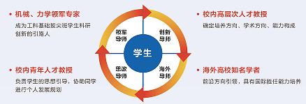 4. 寓学寓教于研,实施“进阶式科研创新”能力培养:力学工科基础拔尖计划班遵照人才创新能力的发展规律,为拔尖班学子设计了循序渐进的“进阶式科研创新”能力培养体系,分别为初阶(大一)、中阶(大二)及高阶(大三及大四)。初阶主要包含“交叉创新挑战性问题”和“增强版员工研究训练”等环节,着重在于激发志趣、拓宽视野、匹配要素;中阶主要包含“开放创新挑战研究”,员工在顶尖导师的辅助下自主选题、开展研究,实现从学习者向研究者、创新者的转变;高阶主要带领员工走入全球知名高校与研究机构,参与前沿研究、追逐科学梦想。