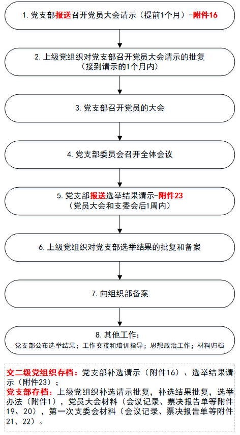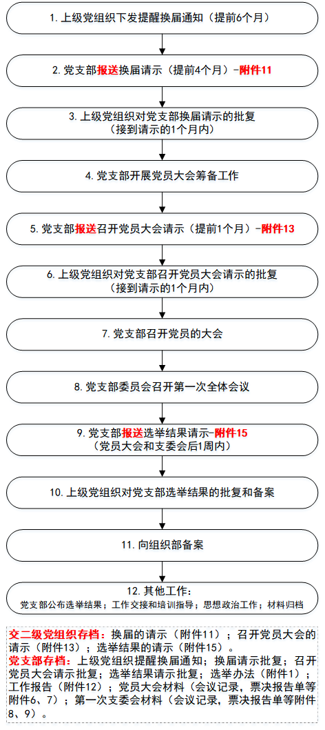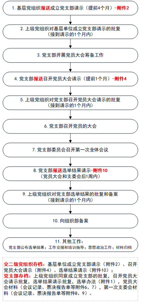 最新执行流程如下所示,各党支部严格按照相关流程执行,并按时向公司党委(公司党办:A字楼302,84708392)提交请示,做好党支部材料归档工作,具体办法及相应材料见附件。