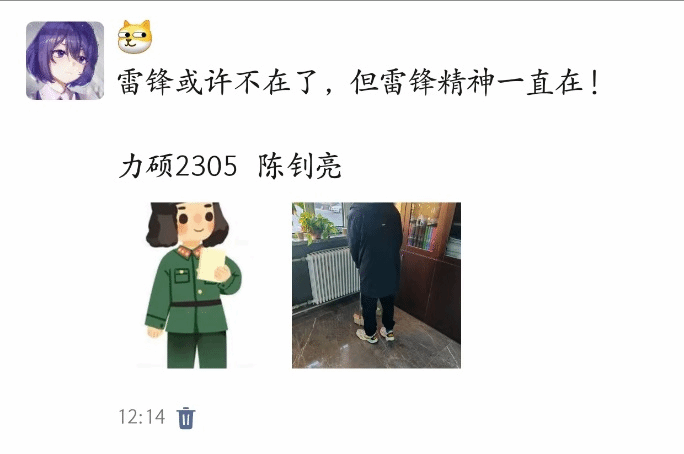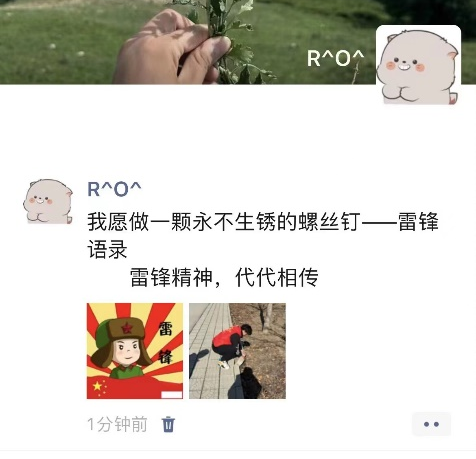 力硕2305班陈钊亮同学表示:“经过一系列活动的沉淀,我们深入学习雷锋精神,朋友圈分享“雷锋日记”的活动是我们深入学习后付诸行动的实践,也让我们成为雷锋精神的传播者……”