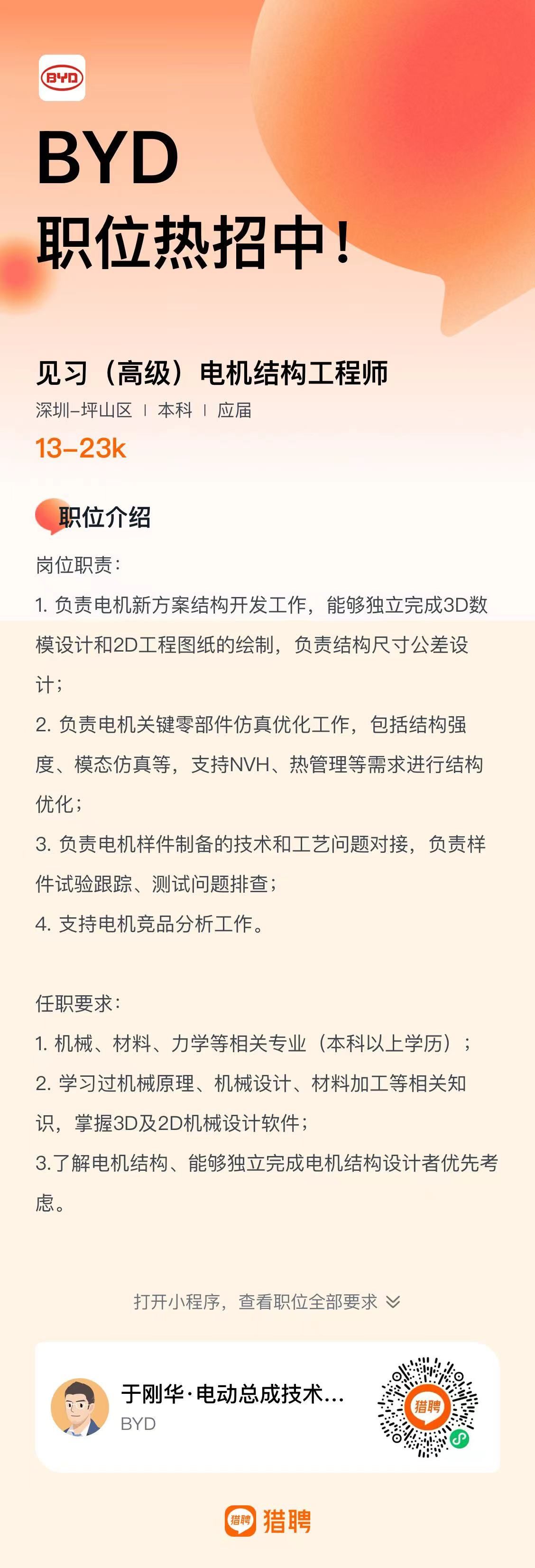 比亚迪见习(高级)电机结构工程师职位热招中