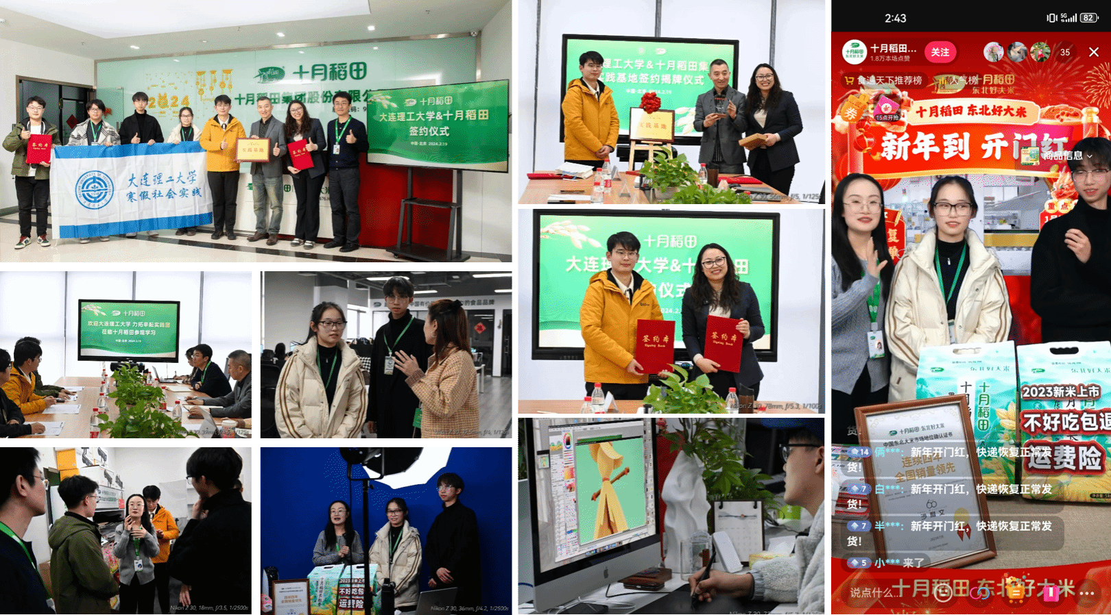 2月中旬,实践团队走访中国领先且快速增长的厨房主食食品企业十月稻田,与公司王兵董事长、联合创始人赵文君女士等企业高管座谈交流,了解公司创业基础和发展历程,讨论乡村振兴路径。并在何洋总监带领下走入公司运营、销售、物流、设计、直播等各个部门,近距离学习运营机制。值得一提的是,实践队员参与到农产品直播中,获得了珍贵的直播体验。最后,指导教师与企业高管现场签署了实践基地协议,举行了揭牌仪式,为未来在乡村振兴领域的深入合作奠定基础。