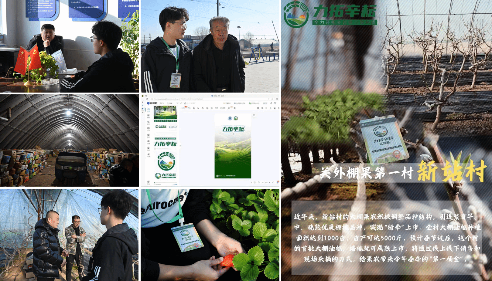在新站村,在村长与果棚种植户的带领下,参观了村内极具规模的大棚,深入田间了解有关大棚种植的相关技术与农业种植知识。走访了大棚采摘户,亲身参与采摘活动,深切感受了田园劳作的乐趣。也了解到大棚目前所面临的困难,包括在利用互联网销售产品方面存在的不足以及宣传推不力的问题,大大降低了产品的竞争力。为了帮助农民增加收入,实践团通过直播等互联网新方式,结合线上线下销售,逐步教导农户如何进行宣传推广,提升产品的销售和竞争力。并凭借自身经验撰写了一份《新媒体运营与经营方案》,设计精美海报,为乡村振兴贡献我们的力量。