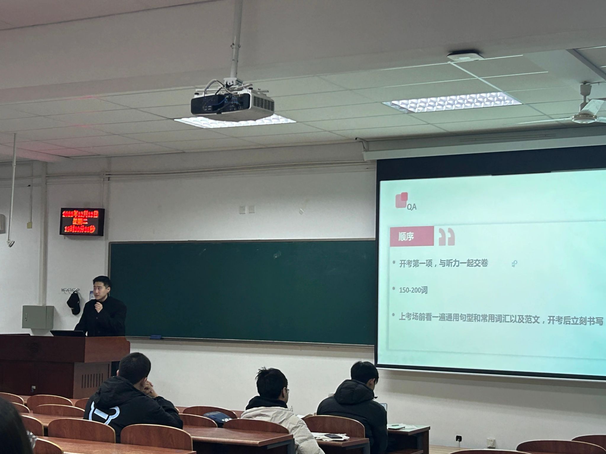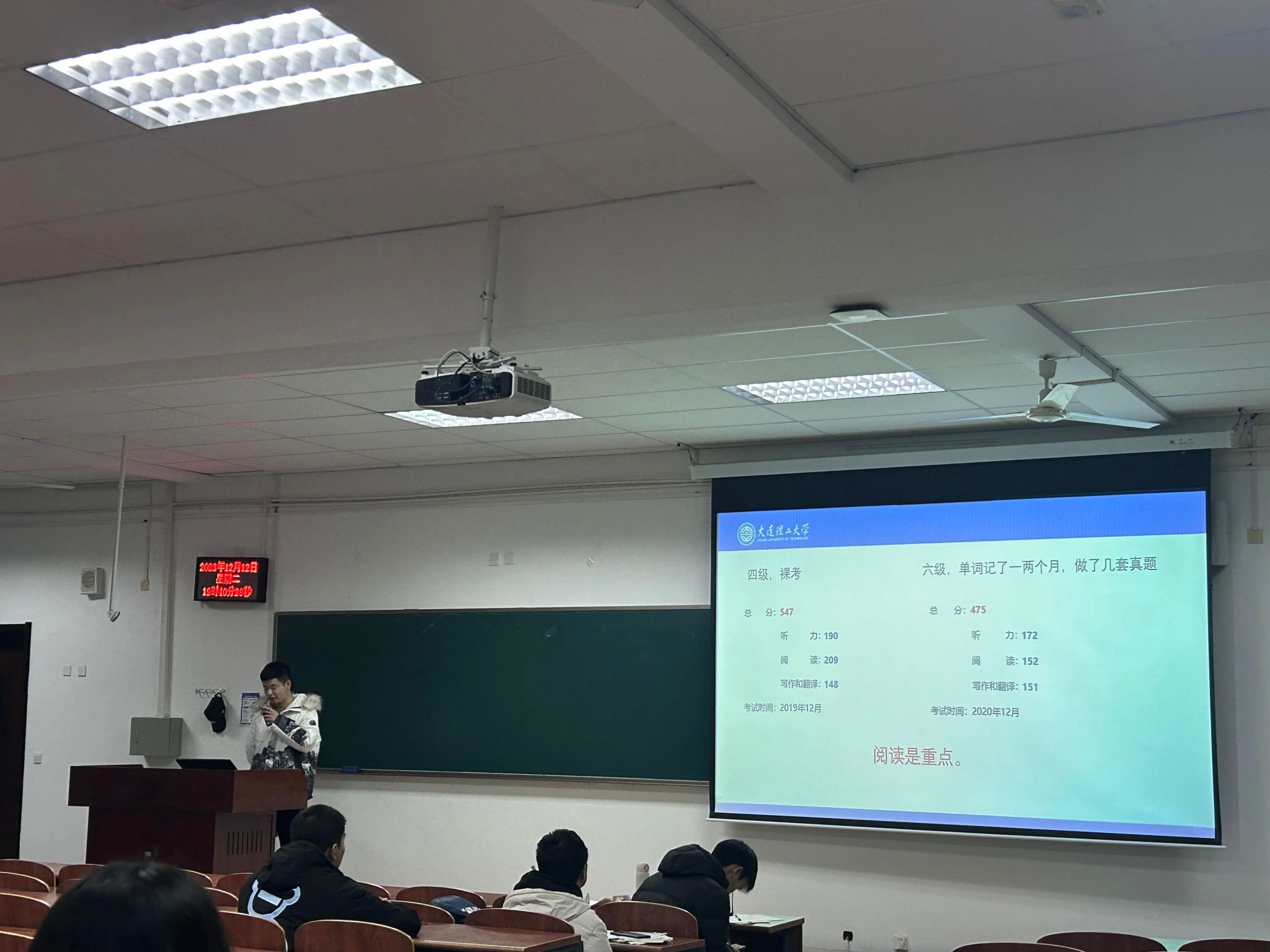 本次分享会特邀请到伟德国际victor1946的夏博涵、宋少杰、陈天雨三位研究生同学和外国语公司的本科生欧阳文静同学,分别从听力、阅读、写作方面进行经验分享。分享会于12月12日晚成功在综合教学二号楼B103举办。