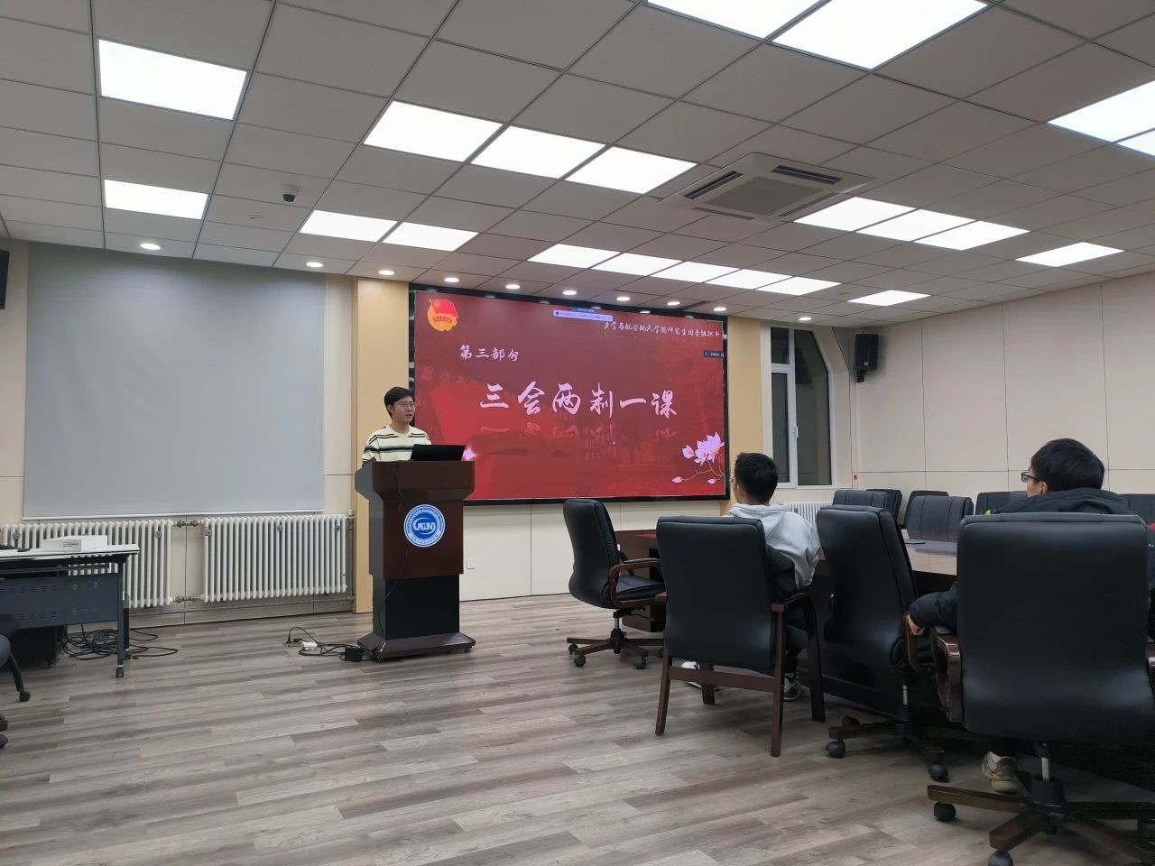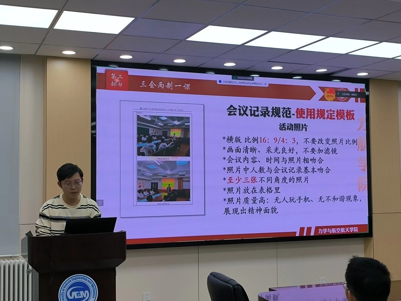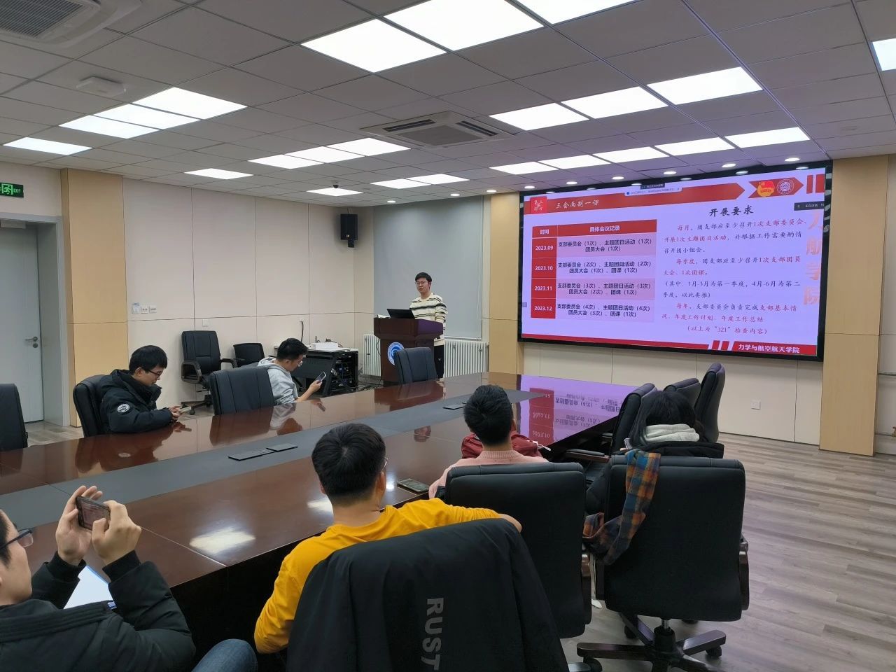 肖凯引首先向团支书们讲解了“智慧团建”的操作方法,以便团支书们今后可以更方便高效地完成基础团务工作。随后肖凯引同学向团支书们说明了“两优一先”的评选方式以及工作内容,让团支书们了解了接下来需开展的工作。最后,肖凯引同学向团支书们解读了“三会两制一课”的具体内容以及开展形式,引用优秀团建手册例予以说明团建手册的撰写要求和注意事项。