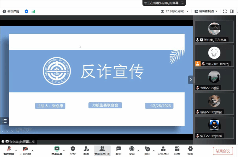 张必康同学向我们介绍了有关电信诈骗的知识,以“为什么要进行反诈宣传”,“常见的诈骗手段”,“怎样提高反诈意识”三方面进行案例分析。