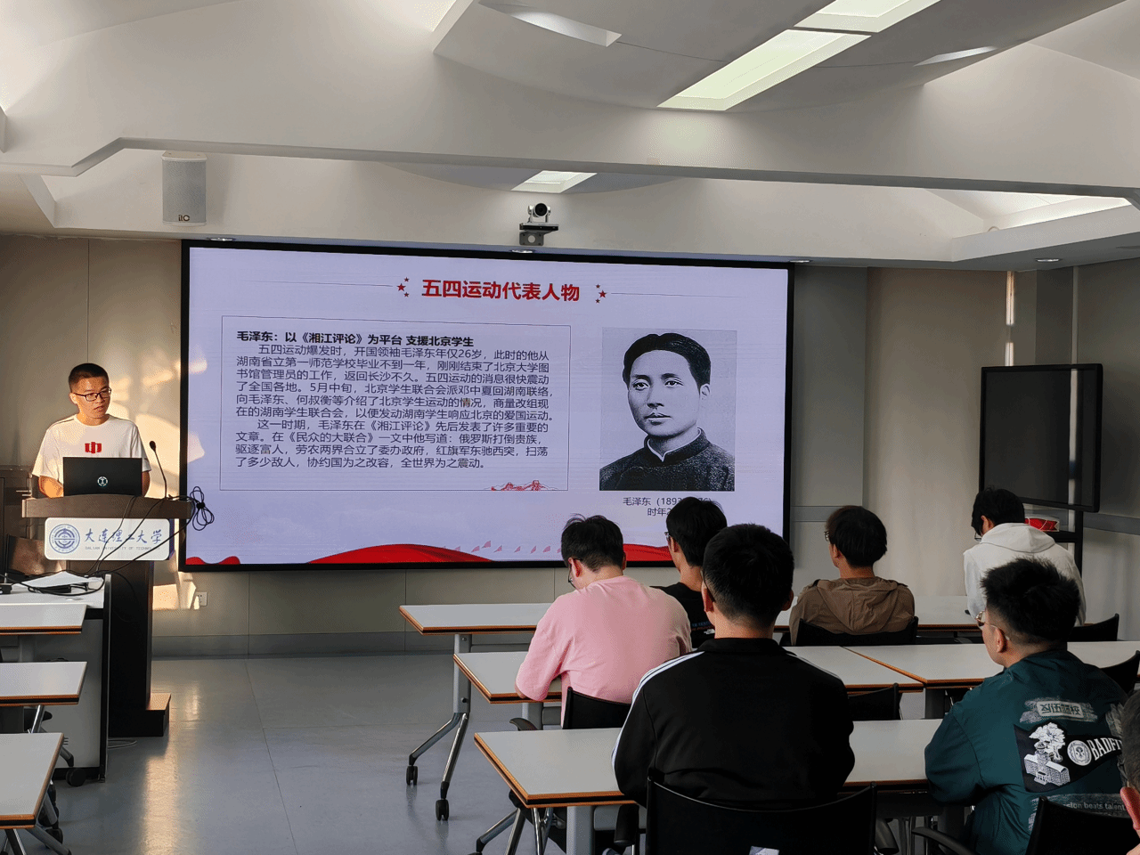 在五四代表人物学习环节,通过介绍毛泽东、周恩来、邓颖超、蔡和森、邓中夏和王尽美等革命先辈在五四运动中的事迹,激励同学们学习他们的革命精神和崇高品质。这些革命先辈在五四运动中发挥了重要作用,他们的故事激励着青年一代继续奋斗。随后,同学们一同观看视频《何为青春,青春何为》,重温五四精神的传承历程。